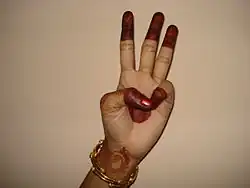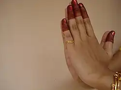 Lastly, all dancers outline their hands and feet with red kumkum powder or alta, a tradition that helps the audience easily see their hand and foot gestures.[102]