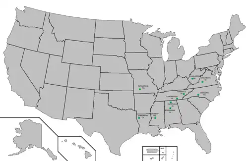 | States |  Alabama  Arkansas  Georgia  Kentucky  Mississippi  North Carolina  Oklahoma  South Carolina  Tennessee and parts of:  Florida  Illinois  Indiana  Kansas  Louisiana  Missouri  New Mexico  Ohio  Texas  Virginia  West Virginia |