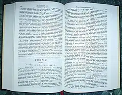 After it had been compared with the Janicki translation, the Brest, the Bohemian, Pagnini's Latin, and the Vulgate, the new rendering was ordered printed.[2] The Janicki translation as such has not been printed, and it is difficult to state how much of it is contained in the new Bible.[2] The New Testament was first published at Gdańsk, 1606, and very often during the 16th and 17th centuries. The complete Bible was issued in 1632, and often since.[2] The Gdańsk Bible differs so much from that of Brest that it may be regarded as a new translation. It is erroneously called also the Bible of Pavel Paliurus (1569–1632) (a Moravian, senior of the Evangelical Churches in Great Poland, d. 1632); but he had no part in the work.