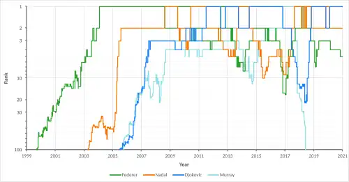 Prior to the adoption of the term Big Three, there was the Big Four, a similar term used from about 2008 to 2016 to describe the quartet of Federer, Nadal, Djokovic, and their nearest and most consistent rival, Andy Murray. Although the volume of Murray's achievements did not match those of the 'Big Three', he was in contention on a similar basis during that period for the biggest trophies, reaching the final at all four majors at least once, winning several major and ATP Masters 1000 titles, in addition to the ATP Finals and the Olympics twice, while being the only other player besides the Big Three to reach the top of the ATP rankings in an 18-year period from 2004 to 2022.[5][6][7] The term is still used when referring to the group. As both a trio and as a quartet, they have been a critical part of what has been labelled a "golden era" in men's tennis.[8][9][10][11]