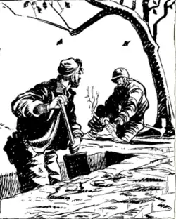 During July 1943, Mauldin's cartoon work continued when, as a sergeant of the 45th Infantry Division's press corps, he landed with the division in the invasion of Sicily and later in the Italian campaign.[4] Mauldin began working for Stars and Stripes, the American soldiers' newspaper; as well as the 45th Division News, until he was officially transferred to the Stars and Stripes in February 1944.[4] Egbert White, editor of the Stars and Stripes, encouraged Mauldin to syndicate his cartoons and helped him find an agent.[5] By March 1944, he was given his own jeep, in which he roamed the front, collecting material. He published six cartoons a week.[6] His cartoons were viewed by soldiers throughout Europe during World War II, and were also published in the United States. The War Office supported their syndication,[7] not only because they helped publicize the ground forces but also to show the grim side of war, which helped show that victory would not be easy.[8] While in Europe, Mauldin befriended a fellow soldier-cartoonist, Gregor Duncan, and was assigned to escort him for a time. (Duncan was killed at Anzio in May 1944.)[9]