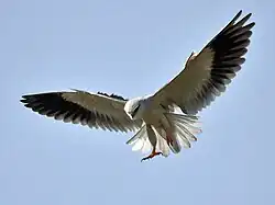 This long-winged raptor is predominantly grey or white with black shoulder patches, wing tips and eye stripe. The long falcon-like wings extend beyond the tail when the bird is perched. In flight, the short and square tail is visible and it is not forked as in the typical kites of the genus Milvus. When perched, often on roadside wires, it often adjusts its wings and jerks its tail up and down as if to balance itself. The sexes are alike in plumage.[9] Their large forward-facing eyes placed under a bony shelf that shades them is distinctive; their velvety plumage and zygodactyl feet[10] are characters shared with owls and the genus has been considered as a basal group within the Accipitridae.[11] They are thought to have been adapted for living in savanna habitats where seasonal rodent population peaks occur. Such food resources are also favoured by the owls. The inner vanes of the feathers have velvety barbules.[12] They have a diploid chromosome number of 68 (some older studies claimed 64 for E.c.caeruleus and 66 for E.c.vociferus) with a distinct karyotype with resemblances to the kites and honey buzzards and suggesting a basal position within the diurnal birds of prey.[13][14]