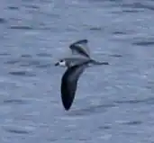 The black-winged petrel is a small species of petrel with long, narrow wings. Its length averages 29 centimetres (11 in) and its wingspan averages 67 centimetres (26 in). It has a small head and short black beak, a slender body and square-cut tail. It has a pale grey cap and nape, white cheeks and a dark grey collar. The dorsal surface of the body is pale grey and the upperside of the wings is pale grey near the base but dark greyish-black along the outer edge. The underparts are white and the outer edges of the wings are black. The tail is barred in black and white.[2]