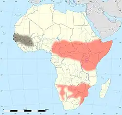 The species prefers moderately dry environments such as light woodland and scrub, rocky outcrops and semi-arid savanna.[23] It also inhabits moist savanna and lowland forests.[13] It is not commonly found at altitudes above 1,000 m (3,300 ft), although its distribution does include locations at 1,800 m (5,900 ft) in Kenya and 1,650 m (5,410 ft) in Zambia.[23] It is rated as a species of least concern on the International Union for Conservation of Nature (IUCN)'s Red List of endangered species, based on its huge range across sub-Saharan Africa and no documented decline.[1]