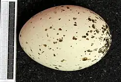 The black vulture lays its eggs on the ground in a wooded area, a hollow log, or some other cavity, seldom more than 3 m (10 ft) above the ground.[34] While it generally does not use any nesting materials, it may decorate the area around the nest with bits of brightly colored plastic, shards of glass, or metal items such as bottle caps.[45] Clutch size is generally two eggs, though this can vary from one to three. The egg is oval and, on average, measures 7.56 cm × 5.09 cm (2.98 in × 2.00 in). The smooth, gray-green, bluish, or white shell is variably blotched or spotted with lavender or pale brown around the larger end.[45] Both parents incubate the eggs, which hatch after 28 to 41 days.[45] Upon hatching, the young are covered with a buffy down, unlike turkey vulture chicks which are white.[51] Both parents feed the nestlings, regurgitating food at the nest site. The young remain in the nest for two months, and after 75 to 80 days, they can fly skillfully.[47] Predation of black vultures is relatively unlikely, though eggs and nestlings are readily eaten if found by mammalian predators such as raccoons, coatis and foxes. Due to its aggressiveness and size, few predators can threaten the fully-grown vulture. However, various eagles may kill vultures in conflicts, and even the ornate hawk-eagle, a slightly smaller bird than the vulture, has preyed on adult black vultures, as well as the two eagles native to North America (north of Mexico).[32][52][53]