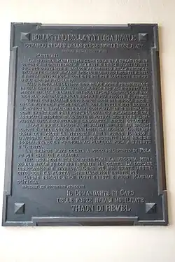 The Bollettino della Vittoria Navale is the official document written after the armistice of Villa Giusti with which the admiral Paolo Thaon di Revel, supreme commander of the Royal Italian Navy, announced, on 12 November 1918, the surrender on the seas of the Austro-Hungarian Empire and Italy's victory in the World War I.