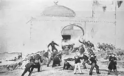 The French fleet arrived in the Bay of Mogador on August 11, 1844, but the weather was so bad that they had to wait, breaking their anchors and unable to communicate even between themselves.[3] Once the weather abated, the French Navy first took up firing positions on 15 August.[3] They were fired upon by the Moroccan batteries first upon taking their positions. After one hour, the French batteries responded, and exchanges lasted for about 3 hours.[3][4] The batteries of the city were silenced one by one, but the batteries on Mogador island remained active, requiring a landing to clear them out.[4]