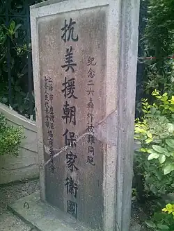 To commemorate the 26 February bombing, on the anniversary of the attack, the Luwan District government of Shanghai funded the creation of the "Shanghai 26 February bombing Memorial" under the name "Memorial Service for the People Who Died in the 26 February bombing." However, due to restrictions imposed by the local traffic management authorities, the memorial stone could not be placed near the bombing site. It wasn't until 1952, after proposals by Huang Yuanqing and Lu Agen, and approval by the second People's Representative Assembly of Shanghai (the predecessor to the Shanghai CPPCC), that the memorial was finally erected within a bamboo fence at 458–468 Xujiahui Road.[31]: 3 During the Korean War, the front of the monument featured the words "Resist America, Aid Korea, Protect the Homeland," while the back carried a 300-character inscription commemorating the victims of the bombing. The memorial was destroyed during the Cultural Revolution but was later repaired, though it fell into disrepair over time.[32] It has since been listed as an immovable cultural heritage site in the third national cultural heritage survey.[33]