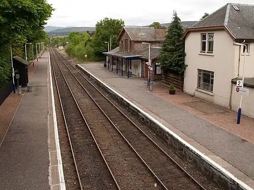 Ardgay railway station is a railway station serving the village of Ardgay and its neighbour Bonar Bridge in the Highland council area of Scotland. The station is on the Far North Line, 57 miles 70 chains (93.1 km) from Inverness, between Tain and Culrain.[5] ScotRail, who manage the station, operate all services.