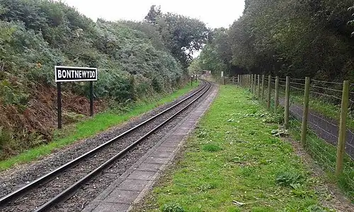 Bontnewydd is an unstaffed halt on the narrow gauge Welsh Highland Railway. The halt was opened on 31 May 1999 on the petition of the villagers of Bontnewydd, and is between Caernarfon and Dinas on the Lôn Eifion cycle route. It is a request stop with no station buildings and a single low platform. The train services are operated by the Festiniog Railway Company.