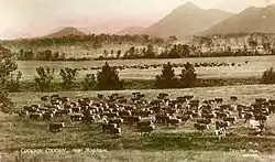 Postcard of Hereford cattle on Coochin Coochin Station, near Boonah, 1909. In the background Mount Moon and both the McPherson Range and Main Range (Great Dividing Range) of the Scenic Rim can be seen.