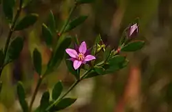 Boronia parviflora, commonly known as the swamp boronia, small boronia, tiny boronia, or small-flowered boronia,[2] is a plant in the citrus family Rutaceae and is endemic south-eastern Australia. It is a weak, low shrub with elliptic to egg-shaped leaves with finely toothed edges and up to three pink, white or green four-petalled flowers arranged at or near the ends of the stems.
