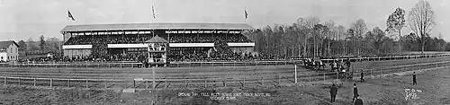 The one-mile oval racetrack, known as Prince George's Park, was opened October 1, 1914, under the auspices of the Southern Maryland Agricultural Society—in actuality, the track's owners were famous Baltimore confidence men Gad Brian and Jim O'Hara.[2][3] A major attraction in the area, easy access for racetrack patrons was available from the WB&A Railroad which ran trains every five minutes from the Liberty Street Station in Baltimore for which they charged 65¢ for a round-trip ticket. Admission to the grounds and grandstand was $1.00.[4]