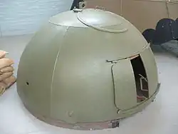 Pillbox formed by a metal turret, which could be rotated through a full 360 degrees, set above a steel and brick-lined pit. It was designed for a machine gun to be fired either through the front loophole which was further protected by shutters, or through the circular opening in the roof in a light anti-aircraft role. According to the manufacturer, it was suitable for Vickers, Bren, Hotchkiss or Lewis machine guns in either a ground defence or anti-aircraft role, or a Boys anti-tank rifle or rifle grenade for ground defence. Weapon change requires selection of appropriate bracket.[88] The army did not favour the design – most were installed at airfields.[89][90]