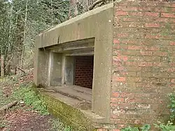 The type 26 also had an important prefabricated variant, in which the shuttering – both inside and out – was provided by precast concrete slabs slotted into reinforced concrete posts. The shuttering was filled with concrete in situ.[35][36] This pillbox was also known as the 'Stent' after the company that produced the prefabricated components, Stent Precast Concrete Limited. On those examples where damage allows inspection of the construction, it seems that the concrete fill was not reinforced.[37]