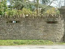 Existing thick walls and heavy buildings provided a ready-made alternative to a pillbox and many were converted to defensive positions by the simple expedient of adding embrasures to them. Whatever might be lacking in protection was made up for by convenience and perfect camouflage.[99] At Beaulieu, Hampshire, an existing dairy storage building was hardened for use as a fortification by thickening the walls and reducing the size of the windows to gunslits, retaining the original windows on the outside as a cover.