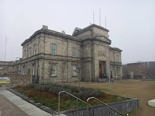 Broadstone - University (DIT until 2024) is a Luas stop on the line. Its name refers to the fact that it was intended to be the closest stop to Dublin Institute of Technology Grangegorman campus. However, the plans were changed at a late stage, adding Grangegorman stop, which is closer to the campus.[15] Construction of the stop involved excavating a large amount of earth from the land in front of the station, and building a road bridge over the tracks which busses can use to access the depot.[16]