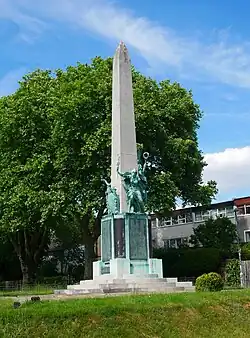 The monument includes a square obelisk constructed of Portland stone, a limestone quarried on the Isle of Portland in the English Channel. It is positioned on a base with three steps. The memorial features three bronze figures adjacent to the lower portion of the obelisk. On the fourth side of the obelisk, the back of the monument, there is a bronze cartouche. In addition, there are bronze plaques with the names of the fallen on all four sides of the base.[6] The statues include a winged Victory in the centre, with a laurel wreath. That statue is flanked by two additional bronze figures, one of Liberty with a torch and the other of Peace with flowers of remembrance.[6] The monument records the names of 769 soldiers from the area who died in World War I. It also lists the names of 476 soldiers and civilians who were killed during World War II.[7][8] The memorial was completed by the sculptor in 1922.[1]