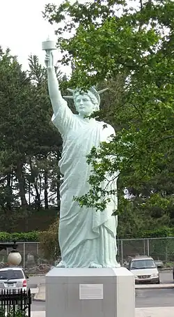The primary elevation of the facade, facing north along Eastern Parkway, is 510 feet (160 m) wide and consists of the west and east wings, which flank a projecting pavilion with a portico. Additional pavilions project from the facade at either end. The center portico contains six Ionic columns that support a pediment with sculptures in its tympanum.[228]: 2 The portico was originally accessed by a staircase that was removed in 1936–1937.[228]: 3 [229] Daniel Chester French was responsible for the pediment sculptures. French also designed the two allegorical figures Brooklyn and Manhattan flanking the museum's entrance; they were created in 1916 for the Brooklyn approach to the Manhattan Bridge and relocated to the museum in 1963.[228]: 3 [230] Above the pediment is a copper cresting with anthemia, as well as a low saucer dome.[228]: 2 [229] The modern main entrance, dating to Polshek's 2004 renovation, consists of a glass pavilion with four metal pylons, as well as a semicircular plaza just outside.[189][184] A set of brick piers, which had supported the original entrance staircase, was repurposed into a brick arch in 2004.[231]