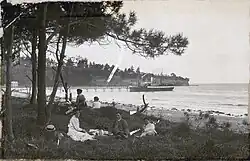 In 1876, Peter Brown purchased an 136 acre property, where he settled with his family, clearing scrubland.[27] The Brown family developed a dairy farm, orchards, a vineyard, an apiary and grew crops including carrots.[29][30] The suburb was named after Peter Brown, and the Brown family operated a guest house in the 1880s for holiday-makers visiting the beach.[31][8][29][5] The roads to Browns Bay were poorly maintained clay tracks, so most visitors to the area came by stream ferry.[8][5] While the area became more popular over the summer months, the permanent population remained low. The first school in the area opened in 1888.[5] The area grew in the early 20th century, after the construction of a new wharf, better roads, and the tram from Bayswater to Milford.[32][8] The Taiotea Boating Club, the first recreational boating club in the East Coast Bays area began operating from Browns Bay circa 1902.[5]