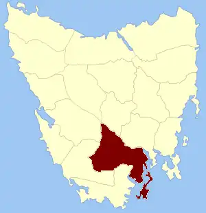 The County of Buckingham, bounded on the north by the river Derwent from its confluence with river Florentine to the sea; on the west by the river Florentine to its source, and thence by a line to the source of the river Huon, and by that river to the sea. This county to include Bruni island, the Egg islands, Huon island, Garden island, Partridge island, Penguin island, Satellite island, Green island, Snake island, Arch island, Actaeon island, and all other islands in D'Entrecasteaux channel.[3]