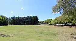 In addition to the ongoing improvements being undertaken throughout the Buderim district by the BWMCC, in July 1946 a proposal for the establishment of an "arboretum" was adopted. It was hoped that "the laying of an arboretum planted with suitable trees ... will add beauty to an already fine natural setting".[57] In December of that year this came to fruition, with the planting of a further 600 trees, comprising 10 species, in the reserve beside the sports ground and the recently planted pine forestry plot at the school. The Buderim War Memorial Arboretum was planted by a large number of community members, including 50 children from the school, and would "serve to perpetuate the memory of those who served in the last two wars".[58] The pine forest was included as part of the war memorial.[1]