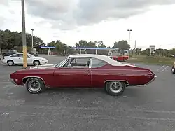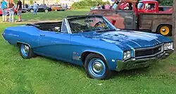 Mid year 1968 saw the official introduction of the California GS, and it is frequently known as a '69 model.[3] Buick asked "Why settle for less when the California GS, built especially for YOU, costs no more?" Exclusively designed for Golden State motorists, Buick advertised the car nationally as a high performance family sports car at an economy car price. Though the car was not included in Buick's yearly catalog it was shown in a two-page black and white fold out brochure. Custom California GS emblems again graced the rear fenders while GS ornamentation could be found in the grille and sail panels. The drivetrain included Buick's new for '68 350-4 V8 with 10.25:1 compression and Rochester (GM) 4GC Quadrajet four-barrel (four-choke) carburetor,[4] producing 280 hp and 375 lb·ft of torque. The two-speed[3] Super Turbine 300 transmission (driving a 3.23:1 rear axle gear, designed for highway cruising)[3] and bench seat interior were again the only choices. Buick also added chrome plated wheels and air cleaner lid to the two-door thin pillar coupe. Tires were 7.75 in (197 mm) on 14 in (36 cm) rims.[3]