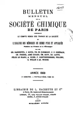 The Bulletin de la Société Chimique de France was a French peer-reviewed scientific journal on chemistry published by the Société Chimique de France.[1] It was established in 1858 under the title Bulletin de la Société Chimique de Paris (ISSN 0991-6504), under which additional name it appeared until the end of series 3.