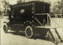 Specially constructed motor trucks were employed by the Bureau in its educational campaign. Each truck contained its own electric light plant, and carried a standard projection machine at the rear end, and a collapsible steel frame which, when set up, supported a projection screen 20 feet wide and 36 feet high. The generator on the truck supplied the necessary current for a number of flood lights placed in the sides of the car body. These trucks carried instructive films to the remotest districts. During World War I, the service of the Bureau was placed at the disposal of the U.S. government and contributed materially to the success of the Liberty Loan campaigns and the various drives for charitable or patriotic purposes.[12]