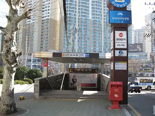 Busan Nat'l Univ. of Edu. Station (Korean: 교대역; Hanja: 敎大驛) is a station of the Busan Metro Line 1 & Donghae Line in Geoje-dong, Yeonje District, Busan, South Korea.
