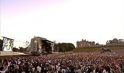 Flea decided that he would finish the album and then quit the band. He was still upset over disputes with Frusciante, who he thought was trying to take over the band.[56] According to Smith, Flea and Frusciante eventually had a sit-down meeting with each other to air out their differences. Frusciante had no idea how Flea was feeling and had no intentions of taking over.[56] Flea also credited practicing Vipassanā meditation along with Frusciante for helping the two repair their musical relationship.[17] With their problems worked out, the band launched their promo tour to support the album on New York City's Ellis Island.[29] Sponsored by the rock radio station K-Rock, the event was titled the "Pep Rally".[29] The band performed eight songs from By the Way, as well as tracks from Californication and Blood Sugar Sex Magik in front of 900 contest winners.[29] The New York Post declared the show "one of the top concerts of the year."[29] The location was chosen in order to reinvigorate lower Manhattan after the September 11 attacks and all proceeds were donated to pertinent charity organizations.[29] Immediately following this, the Red Hot Chili Peppers embarked on a world tour to support the album. Beginning in Europe, they also played at events such as the Fuji Rock Festival and Coachella Valley Music and Arts Festival in between. The band eventually culminated their Europe leg of the tour in February 2003, and commenced the United States leg on May 1.[57] The Red Hot Chili Peppers played at Madison Square Garden in New York City on May 20, 2003, to a sold-out crowd and an enthusiastic response from critics. Kelefa Sanneh of The New York Times reported that "on Tuesday night, the [Red Hot Chili Peppers] came to Madison Square Garden for an extraordinary two-hour performance ... On 'Don't Forget Me', [Flea] strummed chords, while Mr. Frusciante contributed a gorgeous guitar line that bubbled and hissed like some sort of chemical reaction."[58] The US leg ended on June 21; the band took a small hiatus before performing at Slane Castle in Ireland on August 23, to a crowd of over 80,000.[59] Live at Slane Castle, the result of the concert, would become the Chili Peppers' second live DVD, after Off the Map.