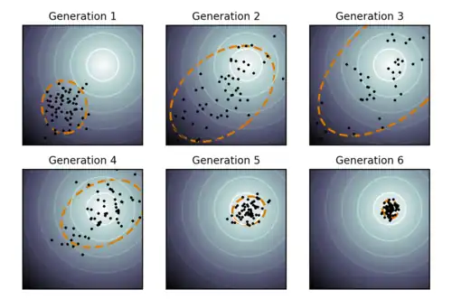 Covariance matrix adaptation evolution strategy (CMA-ES) is a particular kind of strategy for numerical optimization. Evolution strategies (ES) are stochastic, derivative-free methods for numerical optimization of non-linear or non-convex continuous optimization problems. They belong to the class of evolutionary algorithms and evolutionary computation. An evolutionary algorithm is broadly based on the principle of biological evolution, namely the repeated interplay of variation (via recombination and mutation) and selection: in each generation (iteration) new individuals (candidate solutions, denoted as ) are generated by variation of the current parental individuals, usually in a stochastic way. Then, some individuals are selected to become the parents in the next generation based on their fitness or objective function value . Like this, individuals with better and better -values are generated over the generation sequence.
