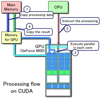 CUDA is a proprietary[2] parallel computing platform and application programming interface (API) that allows software to use certain types of graphics processing units (GPUs) for accelerated general-purpose processing, significantly broadening their utility in scientific and high-performance computing. CUDA was created by Nvidia starting in 2004 and was officially released by in 2007.[3] When it was first introduced, the name was an acronym for Compute Unified Device Architecture,[4] but Nvidia later dropped the common use of the acronym and now rarely expands it.[5]