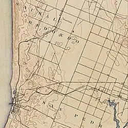 The California Central Railway mainlines were from San Bernardino to Los Angeles at La Grande Station, Oceanside to Los Angeles; and High Grove to Orange. It also ran a 19-mile (31 km) line in Riverside County between Perris to San Jacinto, from May 1887 to May 1, 1888. California Central Railway also built and ran a 13-mile (21 km) line from Port Ballona (present day Playa del Rey, Los Angeles) on Santa Monica Bay, to Redondo Junction (just southwest of present-day Boyle Heights) at the Los Angeles River near Washington Boulevard, which opened in September 1887. Redondo Junction became a major maintenance facility for trains.[2][3][4]