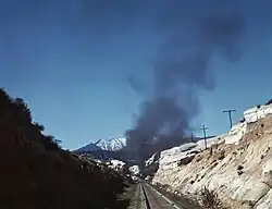 The original grade of the line up the pass rose at a 2.2% slope between San Bernardino and Cajon, where the grade steepened to 3% until reaching the summit 6 miles (9.7 km) further.[18] The route over Cajon Pass was completed with a "last spike" on November 9, 1885,[19] and the first train to use the pass carried a load of rails southward from Barstow on November 12 to be installed near Riverside.[20] The first through train from Chicago via Santa Fe lines arrived in San Diego on November 17, 1885.[21]