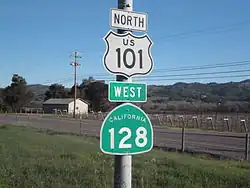 State Route 128 (SR 128) is a state highway in the U.S. state of California, connecting the Mendocino coast to the Sacramento Valley, through the state's Wine Country. It runs from State Route 1 near Albion to Interstate 505 in Winters.