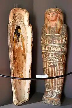 - sycamore anthropoid sarcophagus of Ânkh-pa-in-di-is (honourable mistress of the house), with paint and plaster, probably from Thebes, 23rd Dynasty. Its interior shows the goddess Nut as a Libyan-featured woman in profile in a long flowing tunic and a wig;[12]