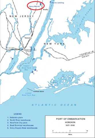 Camp Merritt was a military base in Dumont and Cresskill, in Bergen County, New Jersey, United States, that was activated for use in World War I. It had a capacity for 38,000 transient troops and was one of three camps directly under the control of the New York Port of Embarkation.[1] Two routes were used to transport troops, the first being local railroads which would carry the men South. The alternate route involved marching in contingents of two to three thousand men to the North-East and descending the Palisades. These men marched for an hour to board ferryboats at Old Closter Dock, Alpine Landing that took them to the piers at Hoboken, New Jersey, to board troop transports for Europe.[2] Contingents would leave the camp for the landing at half hour intervals to board the ferries for the two hour trip to the embarkation piers where several transports might be loading simultaneously. There they would be joined by troops from Camp Mills and Camp Upton arriving by train at a terminal on Long Island for final transport by ferry to the embarkation piers.[1][3][4] Approximately four million troops were sent to the Western Front during World War I, and about one million of them passed through Camp Merritt. Camp Merritt was decommissioned in 1919.[5]
