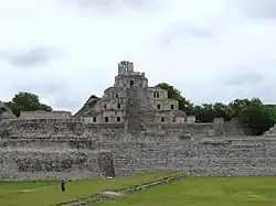 Much of Campeche's territory is filled with various archeological sites, almost all of which are Mayan. Maya sites in Campeche include Acanmul, Balamkú, Becán, Bolonchén, Calakmul, Chactún, Chicanná, Chunlimón, Edzná, Isla de Jaina, Lagunita, the Petén Basin, Río Bec, Isla Uaymil, Xculoc, Xpuhil, and Xtampak. These sites are less visited than sites to the east such as Chichen Itza, and Tulum.[9] An early important site is Edzna, located near the city of Campeche in a region known as los Chenes. It was one of the most important ceremonial centers in the pre-Classic Maya period (300–900 CE). Its building show Petén, Chenes and Puuc influence, with a large acropolis surrounded by various temples, the most important of which is the Pyramid of the Five Floors.[9][31] It was discovered in the 1920s and excavated in the 1940s. It is located away from other Mayan settlements on the peninsula and was probably a collection center for the agriculture products grown in the area, reaching its height between 600 and 900. These were sent to the city of Tikal in exchange for ritualistic adornment for the site. Its most important building is the Pyramid of the Five Stories, built as its name implies. Another important find came in the 1990s. During the planting season in early May, archeologist Antonio Benavides noticed that the setting sun illuminates a stucco mask hanging one of the pyramid's rooms. The effect also happens in August, during harvest and it is believed to be related to the asking and receiving of abundant crops.[9]