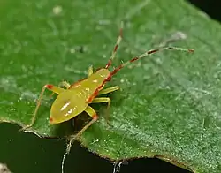 Campyloneura virgula can reach a length of 4–5 millimetres (0.16–0.20 in).[2] Adults have pale translucent hemelytra,[3] a red stripe on the edge of a pale green pronotum, a yellow scutellum, a black head, long red-banded antennae and bright yellow cuneus that are tipped with dark red.[2] Legs are pale yellow.[3] Nymphs are yellow, with a red stripe on the edge of the pronotum.[4]