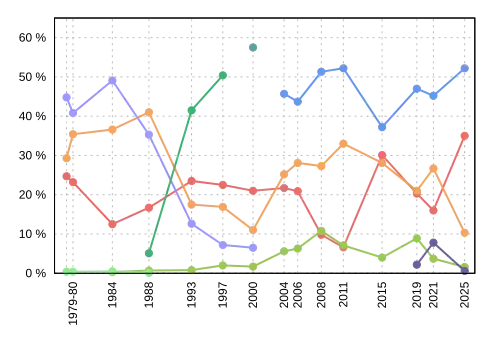 | Election | Liberal | Conservative | New Democratic | Green | People's | PC | Reform / Alliance | Social Credit | Others |