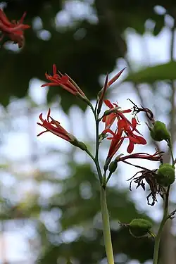 Herb up to 5 m tall.[2] Canna tuerckheimii is a relatively large species with vast stems carrying large green leaves and high carried orange-red flowers. Stems of up to 3 — 3.5m (11½ft) in height. Green leaves, relatively large - 30–100 cm x 15–40 cm (12—36in x 6—16in), lower side and sheaths lanuginose. Flowers are erect orange-red, 5.5 –9 cm (2¼—3½in) long; floral tube not curved, composed of 9 coloured parts; petals not reflexed; with 4 staminodes.[3]