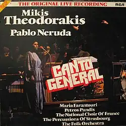Canto General, an oratorio for two voices, mixed choir and orchestra by Mikis Theodorakis based on poems from Canto General by Pablo Neruda was recorded live on August 13, 1975, at the Karaiskakis-Stadium, Pireus and on August 16, 1975, at the Panathinaikos-Stadium, Athens.[1]