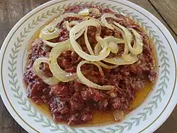 Carne norte guisado, also known as corned beef guisado, is a Filipino dish made from shredded canned corned beef (carne norte) sautéed with onion. It is a very simple dish and is popularly eaten for breakfast with white rice or pandesal. Finely diced potatoes, carrots, scallions, tomatoes, cabbage, bell pepper, and garlic may also be added.[1][2][3][4] A notable variant of the dish is sinabawang corned beef, which just adds beef stock or water to the dish after sautéing, making it soupier.[5][6]