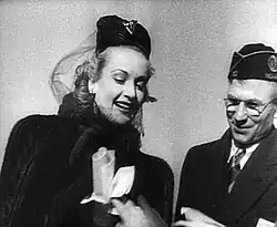 While continuing with a slower work-rate, Lombard decided to move away from comedies and return to dramatic roles.[107] She appeared in Made for Each Other (1939) with James Stewart playing a couple facing domestic difficulties.[108] Reviews for the film were highly positive, and praised Lombard's dramatic effort; financially, it was a disappointment.[109] Lombard's next appearance came with Cary Grant in the John Cromwell romance In Name Only (1939), a credit she personally negotiated with RKO Radio Pictures upon hearing of the script and Grant's involvement.[110] The role reflected her recent experiences, as she played a woman in love with a married man whose wife refuses to divorce. She was paid $150,000 for the film, continuing her status as one of Hollywood's highest-paid actresses, and it was a moderate success.[111] At the 12th Academy Awards ceremony in February 1940, Lombard was quoted as comforting Gable after his loss as Rhett Butler from Gone with the Wind, with the comment "Don't worry, Pappy. We'll bring one home next year". Gable replied that he felt this had been his last chance to which Lombard was said to have replied, "Not you, you self-centered bastard. I meant me."[112][113]