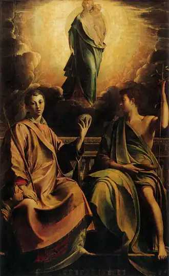 It is named after Casalmaggiore, whither the artist had fled from Parma after imprisonment for non-compliance by the priors of Santa Maria della Steccata and where he spent five months before dying of a fever.[2] It was commissioned for the church of Santo Stefano (now the Duomo) in the town and in 1846 Mortara recorded a tradition that the commissioner was Matteo Cavalli and that Cavalli is shown resting his head on Saint Stephen's leg in the bottom right-hand corner of the work. A preparatory study survives in the Royal Collection at Windsor Castle,[3] along with a drawing of the Madonna and Child for the work in the Gabinetto dei Disegni e delle Stampe in Florence.[4]