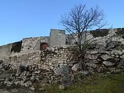 The remains of the fortification are granite and mortar, consisting of an irregular, oval-shaped wall with a thickness of 2.65 metres (8.7 ft) and whose height is a maximum 6.6 metres (22 ft).[1] A smaller redoubt in an elevated part of the site forms a quadrilateral.[1]