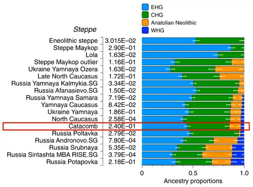 In addition to the Yamnaya culture, the Catacomb culture displays links with the earlier Sredny Stog culture, the Afanasievo culture and the Poltavka culture.[7][8][9]