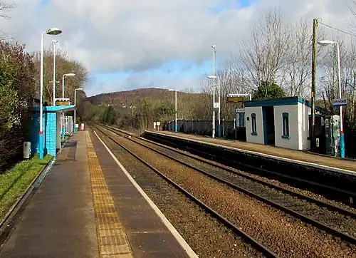 The station used to have a 14-lever signal box to the north of the Bidston-bound platform, and a goods yard adjacent to the western side of the station.[2][3] The signal box was in use until 1945, and the goods yard closed on 14 May 1964.[3][2] The station became unstaffed in 1969, but the main building on the northbound side has survived and is now privately owned.[4] The brick shelter on the southbound side is one of only two still standing of that particular design (the other being at nearby Caergwrle).