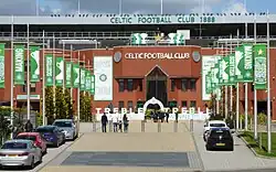In summer 2015, the exterior of the stadium was adorned with a display of printed banners which will remain permanently.[58] Fifteen green-coloured sections at either end of the stadium – each 21 metres high – form a display which reads 'Paradise' and depicts images of noted players from throughout the club's history (58 players in total, with a different set shown on each stand). Photographic banners of significant events and trophy wins are displayed on further panels at the corners between the main stand and the end stands. The project was controlled by the Frame agency with design input from Coatbridge-based artist Jim Scullion.[59][58]